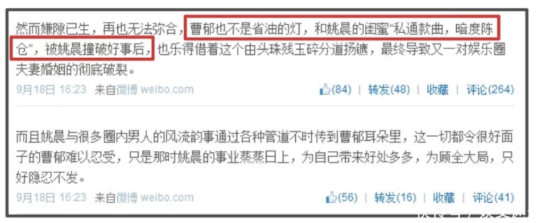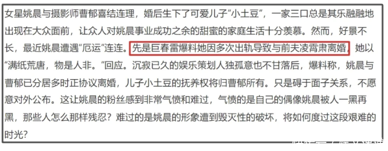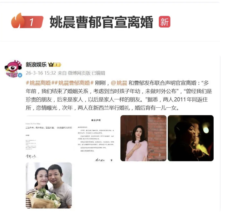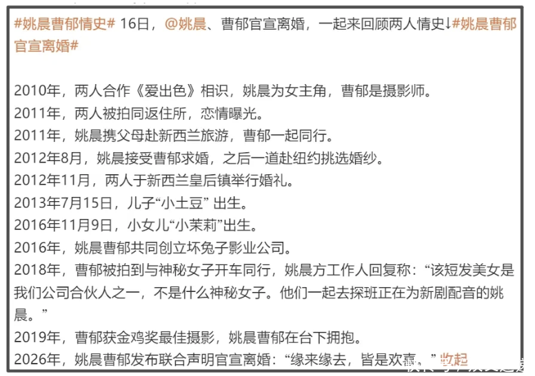 娱乐圈又炸雷了!姚晨和曹郁在16日下午联合发布了离婚声明!